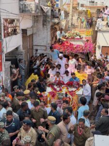 खाटूश्यामजी । सीकर जिले के खाटूश्यामजी कस्बे के प्रसिद्ध बाबा की धार्मिक नगरी में बाबा श्याम के वार्षिक फाल्गुनी लक्खी मेले के तहत आठ दिवसीय लक्खी मेले के सातवें दिन एकादशी के पावन अवसर पर आस्था का अद्भुत नजारा देखने को मिला। शीश के दानी बाबा श्याम नीले घोड़े पर विराजमान होकर नगर भ्रमण पर निकले। रथयात्रा का शुभारंभ बाबा श्याम मंदिर परिसर से हुआ जो मुख्य बाजार होते हुए नगर के प्रमुख मार्गों से होते हुए वापस मंदिर प्रांगण पहुंची।रथयात्रा के दौरान श्रद्धालुओं की भारी भीड़ उमड़ पड़ी। बाबा श्याम के जयकारों से पूरा खाटू धाम गूंज उठा। श्रद्धालु रथ को छूकर आशीर्वाद लेने के लिए आतुर नजर आए जिससे मार्गों पर श्रद्धा और उत्साह का सैलाब दिखाई दिया। जगह-जगह फूलों की वर्षा और भजनों की मधुर धुनों ने माहौल को भक्तिमय बना दिया।