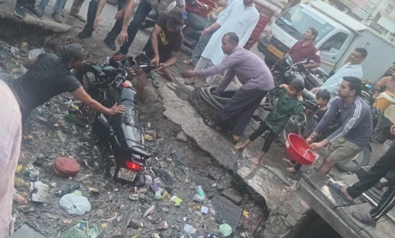 बाइक सवार दो मासूम बच्चों के साथ 6 फुट गहरे नाले में गिरा…