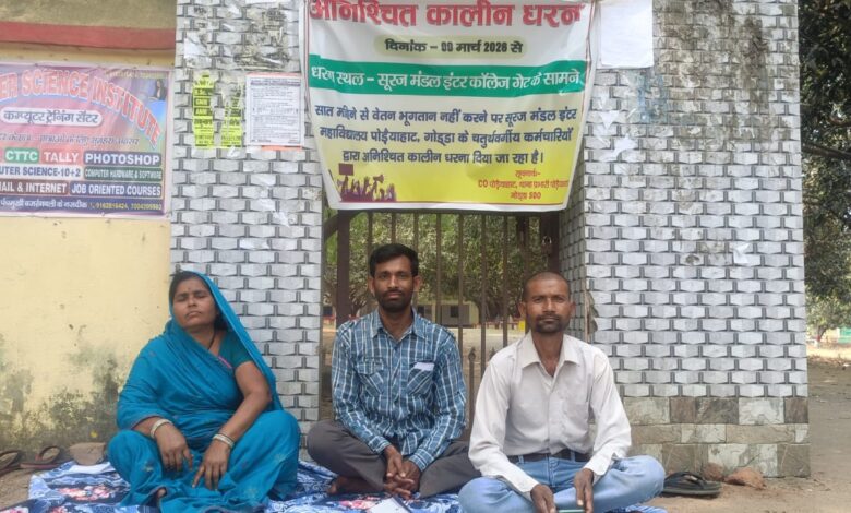 पोड़ैयाहाट। सूरज मंडल इंटर महाविद्यालय में कार्यरत तीन सफाई कर्मी ने सोमवार को महाविद्यालय के मुख्य द्वार पर अनिश्चितकालीन धरना के बैनर तले छ माह से वेतन नहीं मिलने की मांग को लेकर बैठ गए। सफाई कर्मियों ने कॉलेज प्रशासन पर आरोप लगाया है कि कॉलेज प्रशासन मनमानी रवैया अपना कर हम तीन सफाई कर्मियों को छ माह से वेतन भुगतान नहीं किया है।जिसके कारण हम सफाई कर्मी भुखमरी के कगार पर खड़ा हो गए हैं। सफाई कर्मियों का कहना है कि वर्ष 2014 से हम सभी महाविद्यालय में कार्यरत है।जब तक हम सभी का बकाया वेतन भुगतान नहीं करता है तब तक अनिश्चितकालीन धरना जारी रहेगा।