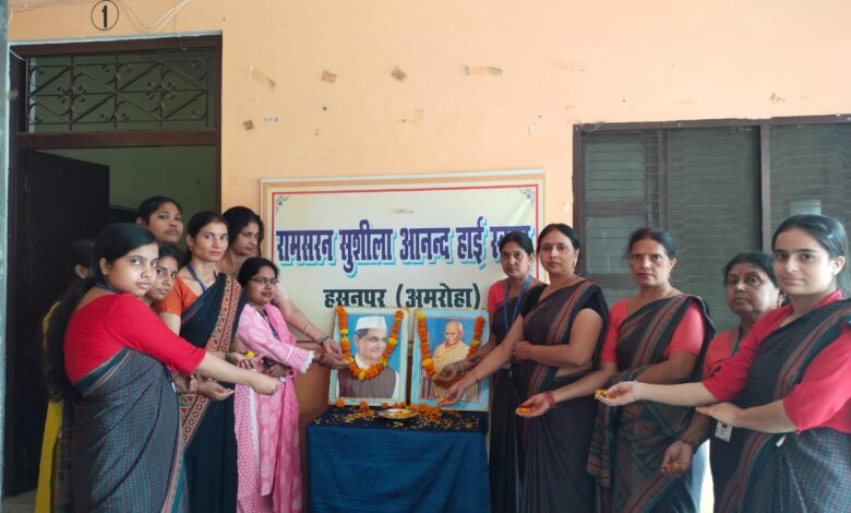 अमरोहा हसनपुर : नगर के मोहल्ला राजपूत कॉलोनी स्थित रामसरन एवं सुशीला आनंद हाई स्कूल के प्रांगण में गुरुवार को एक कार्यक्रम का आयोजन किया गया कार्यक्रम के आयोजन का मुख्य उद्देश्य राष्ट्रीय पिता महात्मा गांधी एवं पूर्व प्रधानमंत्री लाल बहादुर शास्त्री की जयंती बनाना था। छात्र-छात्राओं एवं स्कूल स्टाफ द्वारा दोनों महापुरुषों के चित्र पर पुष्प अर्पित कर उन्हें नमन किया और उनके बताए हुए मार्ग पर चलने का संकल्प लिया। इसी दौरान छात्र-छात्राओं के बीच निबंध एवं वाद विवाद आदि प्रतियोगिताओं का भी आयोजन कराया गया। नन्हे मुन्ने बच्चों द्वारा गांधी एवं शास्त्री जी पर आधारित लघु नाटिका एवं झांकियां भी प्रस्तुत की। विद्यालय अध्यक्ष पंडित रविशंकर शर्मा द्वारा संबोधित करते हुए कहा गया कि गांधी जी एवं शास्त्री जी दोनों ही अद्वितीय व्यक्तित्व की प्रतिमूर्ति थे, हम सबको उनके जीवन से प्रेरणा लेनी चाहिए। इस अवसर पर प्रबंधक सुशील चंद्र सक्सेना,अध्यक्ष रवि शंकर शर्मा, प्रधानाचार्य निशांत त्यागी,सोमवती कश्यप,अंशु त्यागी,अनुराधा चौधरी, भावना सक्सेना,चरन सिंह,मजंली दीक्षित,लक्ष्मी रस्तोगी,स्वाति,नीलम सक्सेना,अतुल मथुर,सीमा वर्मा,रवि वर्मा,प्रदीप,कोमल आदि मौजूद रहे।
