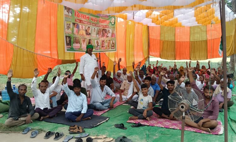 विकास कार्यों में लूट और अवैध कब्जे के विरोध में गंगौली में धरने पर बैठे भाकियू कार्यकर्ता