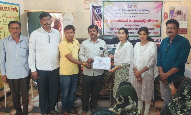 आठनेर। मध्यप्रदेश जन अभियान परिषद विकासखंड आठनेर के निर्देशन में ताप्ती प्रभास नागरिक सेवा समिति सावंगी के द्वारा राज्य कार्यालय के निर्देशानुसार ग्राम विकास प्रस्फुटन समितियों की क्षमता वृद्धि के उद्देश्य से सेक्टर सातनेर का एक दिवसीय प्रशिक्षण कार्यक्रम ग्राम पंचायत टेमनी के पंचायत भवन में आयोजित किया गया।प्रशिक्षण में शासकीय योजनाओं का प्रभावी प्रचार-प्रसार,पात्र हितग्राहियों को योजनाओं का लाभ दिलाने,समग्र ग्राम विकास,पर्यावरण संरक्षण तथा दस्तावेजीकरण जैसे महत्वपूर्ण विषयों पर विस्तार से जानकारी दी गई।कार्यक्रम का शुभारंभ मां भारती के समक्ष दीप प्रज्ज्वलन एवं माल्यार्पण से किया गया।मध्यप्रदेश जनअभियान परिषद विकासखंड आठनेर की विकासखंड समन्वयक मधु चौहान ने जन अभियान परिषद की अवधारणा एवं कार्यों को स्पष्ट करते हुए बताया कि ग्राम विकास प्रस्फुटन समितियां शासन और ग्रामीण जनता के बीच महत्वपूर्ण कड़ी का कार्य करती हैं।यदि समितियां सक्रिय रूप से कार्य करें तो शासन की योजनाओं का लाभ अंतिम व्यक्ति तक आसानी से पहुंचाया जा सकता है।इस हेतु समिति सदस्यों को गांव के लोगों को विभिन्न शासकीय योजनाओं की जानकारी देने और पात्र हितग्राहियों को लाभ दिलाने हेतु सक्रिय भागीदारी सुनिश्चित करना चाहिए।जन भागीदारी से ही ग्राम का समग्र विकास सुनिश्चित होगा।नवांकुर संस्था ताप्ती प्रभास नागरिक सेवा समिति के अध्यक्ष दिनेश माकोड़े के द्वारा समग्र ग्राम विकास की अवधारणा पर भी प्रकाश डाला गया।जिसमें शिक्षा, स्वास्थ्य,स्वच्छता,जल संरक्षण,आजीविका संवर्धन और सामाजिक समरसता जैसे विषयों को शामिल कर गांव के सर्वांगीण विकास पर बल दिया गया।समाजसेवी एवं पूर्व परामर्शदाता आशुतोष सिंह चौहान के द्वारा पर्यावरण संरक्षण के अंतर्गत अधिक से अधिक वृक्षारोपण,जल संरक्षण,स्वच्छता अभियान और प्राकृतिक संसाधनों के संरक्षण के लिए जनभागीदारी बढ़ाने की बात कही गई।सेक्टर की परामर्शदाता राधिका बारपेटे ने दस्तावेजीकरण के महत्व को भी समझाया।उन्होंने कहा कि समितियों द्वारा किए जा रहे कार्यों,बैठकों और योजनाओं के क्रियान्वयन का सही रिकॉर्ड रखा जाना चाहिए जिससे समिति कार्यों में विश्वसनीयता एवं पारदर्शिता बनी रहती है।कार्यक्रम में उपस्थित सभी समिति सदस्यों ने अपने-अपने गांवों में शासकीय योजनाओं का व्यापक प्रचार-प्रसार करने,पात्र हितग्राहियों को योजनाओं का लाभ दिलाने तथा ग्राम विकास के कार्यों में सक्रिय भूमिका निभाने तथा अपने गांव को आदर्श ग्राम बनाने का संकल्प लिया। कार्यक्रम में मुख्य रूप से विकासखण्ड समन्वयक श्रीमती मधु चौहान,ग्राम पंचायत टेमनी के सरपंच सरपंच संतुल