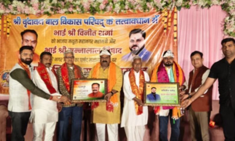 मथुरा। वृंदावन बाल विकास परिषद ने भाजपा महानगर महामंत्री विनीत शर्मा और नगर निगम पार्षद मुन्नालाल निषाद के सम्मान में एक समारोह आयोजित किया। एलिगेंस रिजॉर्ट्स, देवी आटस सड़क पर आयोजित समारोह की अध्यक्षता पंडित सत्यवान शर्मा और ठाकुर कालीचरण सिंह ने की। उन्होंने विनीत शर्मा और मुन्ना निषाद को वृंदावन की युवा शक्ति का परिचायक बताया। मुख्य अतिथि भूमि इंटरनेशनल ग्रुप के अध्यक्ष सुरेन उतरेजा ने कहा कि दोनों नेता मथुरा वृंदावन के सर्वांगीण विकास में अहम भूमिका निभाएंगे। विशिष्ट अतिथि अमायरा ग्रुप के निदेशक राहुल सहगल ने राजनीति में युवाओं के बढ़ते नेतृत्व को ब्रजभूमि के स्वर्णिम भविष्य का संकेत बताया। भाजपा मंडल अध्यक्ष जितेंद्र वाष्र्णेय ने कहा कि उनके नेतृत्व में जनसमस्याओं के समाधान के प्रयास सार्थक होंगे। विनीत शर्मा ने पार्टी द्वारा सौंपी गई जिम्मेदारी को पूरी निष्ठा से निभाने और संगठन को मजबूत करने का संकल्प लिया। मुन्नालाल निषाद ने जनता की सेवा और क्षेत्र के विकास को अपनी प्राथमिकता बताया। इस अवसर पर पंडित श्याम बिहारी चतुर्वेदी, अवधेश गौतम राजू, मुकेश कृष्ण शर्मा, जितेंद्र कुमार गौतम, चेतन्य कृष्ण शर्मा, राहुल अग्रवाल, पवन ठाकुर, योगेश शुक्ला, पंकज बंसल आदि मौजूद रहे।