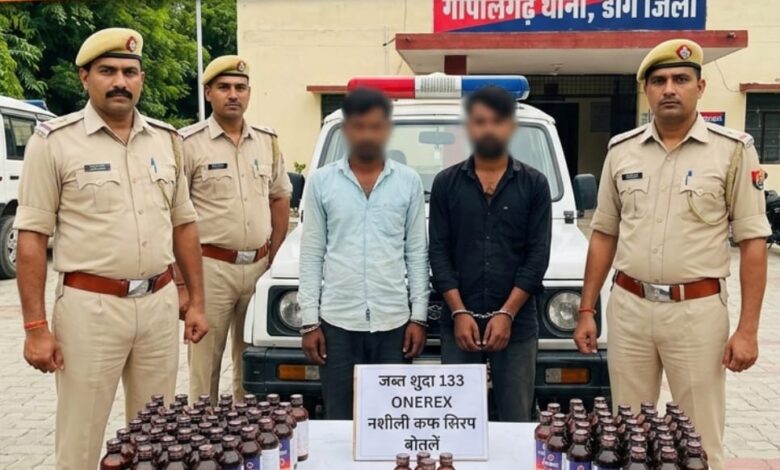 थाना गोपालगढ की पुलिस टीम द्वारा नशीली दवाईयों सहित दो आरोपियों को किया गिरफतार 133 प्लास्टिक की वनरैक्स (कोडीन फास्फेट & त्रिपरोलीडीन हाइड्रोक्लोराइड सिरप) 100एमएल की बोतले एवं एक स्विफ्ट कार जब्त डीग पुलिस की एनडीपीएस एक्ट के तहत कार्यवाही थाना गोपालगढ मनीश शर्मा पु. नि थानाधिकारी गोपालगढ ने मय टीम दवारा नशीली दवाईयो की सूचना पर दौराने नाकाबंदी ग्राम टैकडाबास-अंधवाडी बंद पर, एक स्विफ्ट कार रजि न आर जे 02 सी जे 1993 में एक सफेद रंग के प्लास्टिक के कट्टे को खोलकर चैक किया तो कट्टे में तरल पदार्थ से भरी हुई कुल 133 प्लास्टिक की बोतलें जो वनरैक्स (कोडीन फास्फेट & त्रिपरोलीडीन हाइड्रोक्लोराइड सिरप) 100एमएल जिसपर पुलिस टीम द्वारा दो आरोपीयों को गिरफ्तार किया