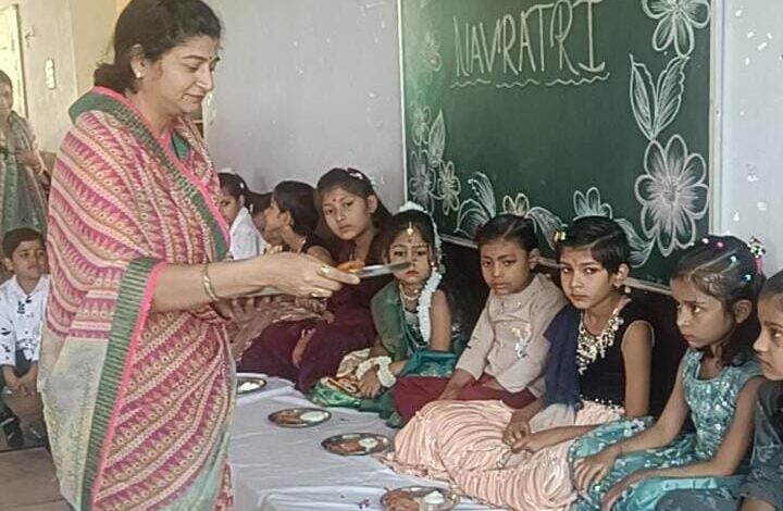 विद्यालय परिसर में विधि-विधान से छोटी-छोटी कन्याओं का पूजन कर उन्हें सम्मानित किया