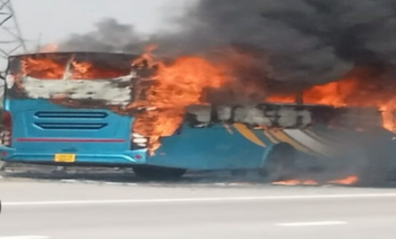 यमुना एक्सप्रेसवे पर चलती बस में लगी आग, मची चीख-पुकार