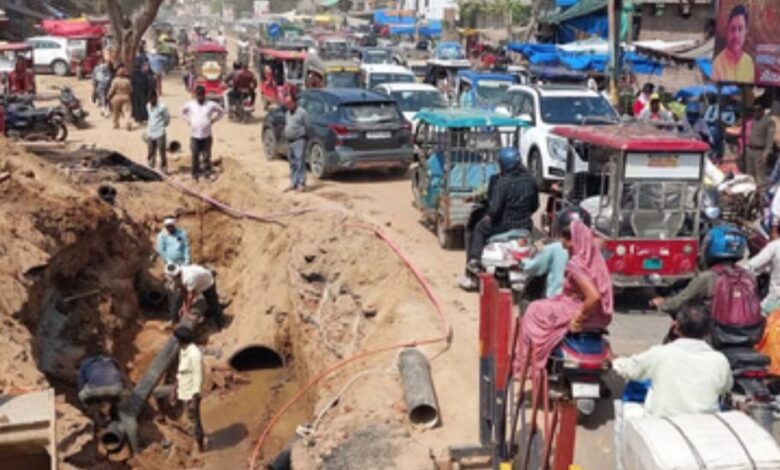 मथुरा। बारिश के मौसम में जलनिकासी के लिए भूतेश्वर से मसानी तक बिछाई जा रही है पाइप लाइन कार्य के चलते डीगगेट पर गंगाजल की पाइल लाइन क्षतिग्रस्त हो गई। जल विभाग ने गड्ढा खोदकर पाइप लाइन को दुरुस्त कराया। इससे यातायात व्यवस्था बाधित हो गई और राहगीर घंटों जाम में फंसे रहे। पाइप लाइन फटने की सूचना मिलते ही जल विभाग की टीम मौके पर पहुंची और मरम्मत कार्य शुरू किया गया। मरम्मत के लिए बीच सड़क पर गहरा गड्ढा खोदना पड़ा, जिससे डीगगेट से लेकर मसानी चौराहा तक जाम लग गया। देखते ही देखते सड़क के दोनों ओर वाहनों की लंबी कतारें लग गई। राहगीरों को भारी परेशानी का सामना करना पड़ा। शाम तक जल विभाग के कर्मचारी पाइप लाइन को दुरुस्त करने में जुटे रहे। महाप्रबंधक जल ने अनवर ख्वाजा ने बताया कि गंगाजल की पाइप लाइन दुरुस्त कराई जा रही है।