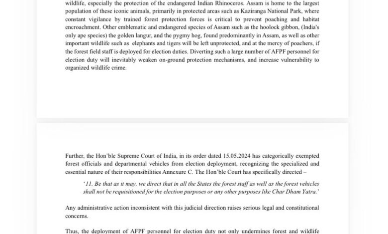 असम सरकार के पर्यावरण, वन एवं जलवायु परिवर्तन विभाग के विशेष मुख्य सचिव एम के यादव (जिन्हें असम कैबिनेट द्वारा पर्यावरण, वन और जलवायु परिवर्तन विभाग के विशेष मुख्य सचिव के रूप में अस्थायी रूप से नियुक्त किया गया था) द्वारा 19 मार्च 2026 को जारी आदेश पर रिटायर्ड IAS और IFS अधिकारियों तथा वन संरक्षणवादियों ने गंभीर आपत्ति जताई है। इस आदेश में असम फॉरेस्ट प्रोटेक्शन फोर्स (AFPF) के लगभग 1600 कर्मियों को आगामी चुनाव ड्यूटी पर तैनात करने का निर्देश दिया गया है, जो चुनाव आयोग ऑफ इंडिया (ECI) के स्पष्ट दिशानिर्देशों तथा सुप्रीम कोर्ट के आदेशों का प्रत्यक्ष उल्लंघन है। रिटायर्ड अधिकारियों के समूह ने मुख्य सचिव, असम सरकार; मुख्य निर्वाचन अधिकारी/कमिश्नर, असम तथा विशेष मुख्य सचिव, पर्यावरण, वन एवं जलवायु परिवर्तन विभाग को पत्र लिखकर इस आदेश को तत्काल वापस लेने की मांग की है। पत्र पर हस्ताक्षर करने वालों में मीना गुप्ता IAS (सेवानिवृत्त), पूर्व सचिव, पर्यावरण एवं वन मंत्रालय; डॉ. ए.के. झा IFS (सेवानिवृत्त), पूर्व PCCF महाराष्ट्र; डॉ. उमा शंकर सिंह IFS (सेवानिवृत्त), पूर्व PCCF उत्तर प्रदेश; प्रेरणा सिंह बिंद्रा, पूर्व सदस्य, स्टैंडिंग कमिटी नेशनल बोर्ड फॉर वाइल्डलाइफ; देबादित्यो सिन्हा, वन्यजीव संरक्षणवादी एवं विधि-नीति विश्लेषक तथा प्राकृति श्रीवास्तव IFS (सेवानिवृत्त), पूर्व PCCF केरल शामिल हैं। प्राकृति श्रीवास्तव ने सह-हस्ताक्षरकर्ताओं की ओर से पत्र पर हस्ताक्षर किए हैं। पत्र में कहा गया है कि ECI के दिशानिर्देशों के अनुसार, क्षेत्रीय वन बलों तथा सेवारत वन अधिकारियों—जिसमें वरिष्ठ IFS अधिकारी भी शामिल हैं—को चुनाव संबंधी ड्यूटी पर नहीं लगाया जा सकता। ये निर्देश वन संरक्षण एवं प्रबंधन के महत्वपूर्ण कार्यों को किसी भी समय बाधित न होने देने के लिए हैं। AFPF की तैनाती असम के वैश्विक महत्व के वन्यजीवों के संदर्भ में विशेष रूप से चिंताजनक है, जहां लुप्तप्राय भारतीय गैंडे की सबसे बड़ी आबादी काजीरंगा नेशनल पार्क जैसे संरक्षित क्षेत्रों में है।असम में हूलॉक गिबन (भारत की एकमात्र वानर प्रजाति), गोल्डन लंगूर, पिग्मी हॉग, हाथी तथा बाघ जैसे प्रतीकात्मक एवं लुप्तप्राय प्रजातियां प्रमुख रूप से पाई जाती हैं। AFPF कर्मियों की चुनाव ड्यूटी पर तैनाती से जमीनी स्तर पर संरक्षण तंत्र कमजोर हो जाएगा, जिससे संगठित वन्यजीव अपराधियों के लिए खतरा बढ़ेगा। पत्र में चेतावनी दी गई है कि शिकारियों एवं अतिक्रमणकारियों के हवाले हो जाएंगे ये क्षेत्र। इसके अलावा, भारत के माननीय सर्वोच्च न्यायालय ने 15 मई 2024 के आदेश में वन अधिकारियों एवं विभागीय वाहनों को चुनाव ड्यूटी से स्पष्ट रूप से छूट दी है। अदालत ने निर्देश दिया था कि सभी राज्यों में वन कर्म