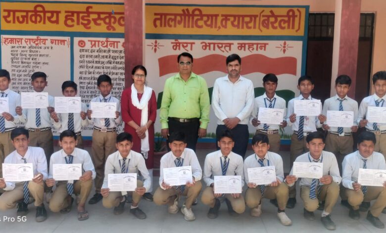 बरेली : राजकीय हाईस्कूल तालगौटिया, क्यारा, बरेली में कक्षा 9 का परीक्षाफल अत्यंत उत्साह एवं हर्षोल्लास के साथ घोषित किया गया। विद्यालय स्तर पर खुशी सिंह ने प्रथम तथा स्वाति ने द्वितीय स्थान प्राप्त कर अपने परिश्रम और लगन का उत्कृष्ट उदाहरण प्रस्तुत किया। अपना परीक्षाफल प्राप्त करते ही विद्यार्थियों के चेहरे प्रसन्नता की दिव्य आभा से आलोकित हो उठे।