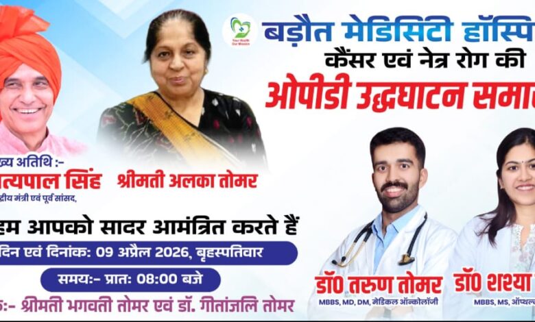 बड़ौत। कस्बे के मेडिसिटी हॉस्पिटल में स्वास्थ्य सेवाओं के क्षेत्र में एक नई पहल के तहत कैंसर एवं नेत्र रोग ओपीडी का शुभारंभ किया जा रहा है। यह शुभ अवसर 9 अप्रैल 2026, दिन बृहस्पतिवार को आयोजित होगा, जिसमें मुख्य अतिथि के रूप में पूर्व केंद्रीय मंत्री एवं पूर्व सांसद Dr. Satya Pal Singh उपस्थित रहेंगे।कार्यक्रम का शुभारंभ प्रातः 8:00 बजे हवन पूजन के साथ किया जाएगा, जिसके उपरांत ओपीडी का विधिवत उद्घाटन होगा। इस पहल से क्षेत्र के मरीजों को अब कैंसर और नेत्र रोग से संबंधित परामर्श एवं उपचार की बेहतर सुविधाएं स्थानीय स्तर पर ही उपलब्ध हो सकेंगी।मेडिसिटी हॉस्पिटल के संचालक डॉ. मनीष तोमर एवं डॉ. गीतांजलि तोमर ने क्षेत्रवासियों से अपील करते हुए कहा कि वे इस शुभ अवसर पर अधिक से अधिक संख्या में उपस्थित होकर कार्यक्रम की शोभा बढ़ाएं तथा इस नई स्वास्थ्य सुविधा का लाभ उठाएं। अस्पताल प्रबंधन ने इसे जनसेवा की दिशा में एक महत्वपूर्ण कदम बताते हुए सभी गणमान्य नागरिकों, समाजसेवियों एवं आमजन को कार्यक्रम में सादर आमंत्रित किया है।
