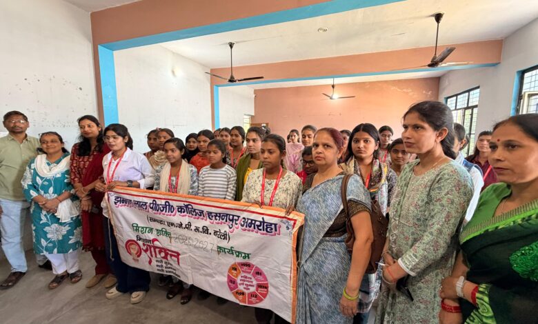अमरोहा हसनपुर नगर के झम्मन लाल पीजी कॉलेज में मिशन शक्ति फेज पांच द्वितीय चरण के अंतर्गत सरकारी योजनाओं की जानकारी एवं उसके लाभ के बारे में अवगत कराया गया। महाविद्यालय की प्राचार्य डॉक्टर शमा प्रवीन ने छात्राओं को आत्मनिर्भर बनने के लिए प्रेरित किया। कार्यक्रम डॉक्टर उर्वशी, डॉक्टर गीतांजलि, एवं मधु चौहान द्वारा संपन्न कराया गया। जिसमें डॉक्टर हिरदेश कुमार, कुमुद त्यागी, डाक्टर स्वादेकीन, पंकज कुमार, मनोज कुमार ,दिनेश कुमार एवं सभी छात्राएं उपस्थित रही।
