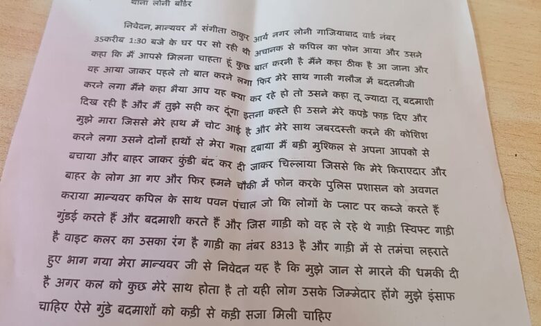 लोनी गाजियाबाद : लोनी बॉर्डर थाना क्षेत्र में एक महिला के साथ मारपीट और बदसलूकी का मामला सामने आया है। पीड़िता संगीता ठाकुर ने थाना प्रभारी को लिखित शिकायत देकर आरोप लगाया है कि आर्य नगर इलाके में दोपहर करीब 1:30 बजे आरोपी कपिल ने उन्हें फोन कर मिलने के लिए बुलाया।महिला के अनुसार, जब वह आरोपी से मिलने पहुंचीं तो उसने पहले बातचीत की और फिर गाली-गलौज करते हुए बदतमीजी शुरू कर दी। विरोध करने पर आरोपी ने उनके कपड़े फाड़ दिए और मारपीट की, जिससे उनके हाथ में चोट आई। इतना ही नहीं, आरोपी ने उनका गला दबाने की भी कोशिश की।पीड़िता ने बताया कि किसी तरह खुद को बचाकर वह बाहर निकलीं और शोर मचाया, जिसके बाद आसपास के लोग मौके पर पहुंचे। इसके बाद पुलिस को सूचना दी गई।शिकायत में महिला ने यह भी आरोप लगाया है कि आरोपी कपिल अपने साथी पवन पांचाल के साथ इलाके में गुंडागर्दी करता है और लोगों के प्लॉटों पर अवैध कब्जा करता है। घटना के दौरान आरोपी एक सफेद रंग की स्विफ्ट कार (नंबर 8313) में आया था और हथियार लहराते हुए मौके से फरार हो गया।पीड़िता ने पुलिस से आरोपियों के खिलाफ सख्त कार्रवाई की मांग करते हुए कहा है कि उन्हें जान से मारने की धमकी दी गई है। उन्होंने आशंका जताई कि अगर उनके साथ कोई अनहोनी होती है तो इसके लिए आरोपी ही जिम्मेदार होंगे।