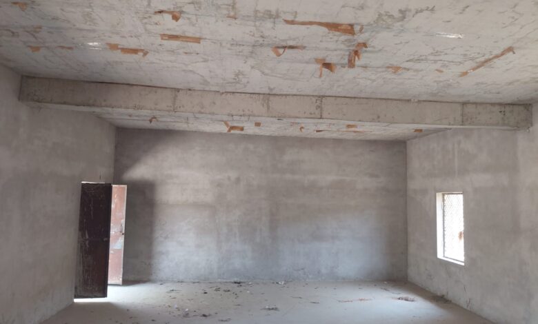 नवनिर्मित कक्ष की तीनों बीमों आयीं दरारों के साथ छत में आया झुकाव