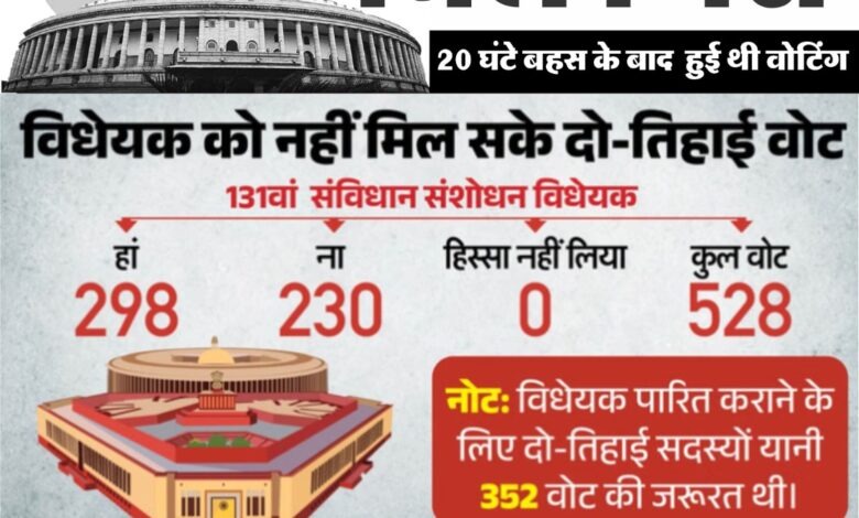 नई दिल्ली। लोकसभा अध्यक्ष ओम बिरला ने कहा कि यह विधेयक दो-तिहाई सदस्यों द्वारा पारित नहीं हो सका। कुल 528 सदस्यों ने मतदान किया, जिसमें 298 सांसदों ने इस विधेयक के समर्थन में मतदान किया, जबकि 230 सांसदों ने इसके विरोध में वोट डाला। वोटिंग से पहले गृह मंत्री अमित शाह ने विपक्ष पर कड़ा प्रहार किया। लाइव अपडेट्स के लिए अभी क्लिक करें।