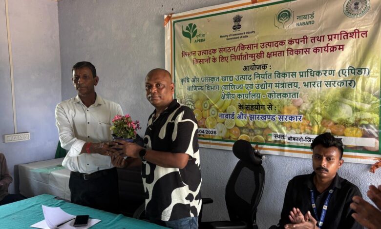 बोकारो। कृषक पाठशाला, नावाडीह परिसर में किसानों को वैश्विक बाजार से जोड़ने के उद्देश्य से निर्यातोन्मुखी क्षमता विकास कार्यक्रम का आयोजन किया गया। यह कार्यक्रम कृषि और प्रसंस्कृत खाद्य उत्पाद निर्यात विकास प्राधिकरण (वाणिज्य एवं उद्योग मंत्रालय, भारत सरकार), नाबार्ड एवं झारखंड सरकार के सौजन्य से आदर्श ग्राम विकास सेवा समिति द्वारा आयोजित किया गया। इसमें किसान उत्पादक संगठनों (FPO) तथा प्रगतिशील किसानों ने बढ़-चढ़कर भाग लिया।
