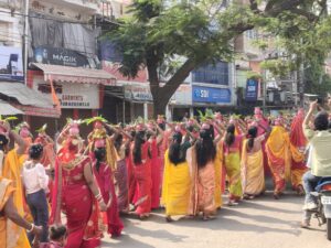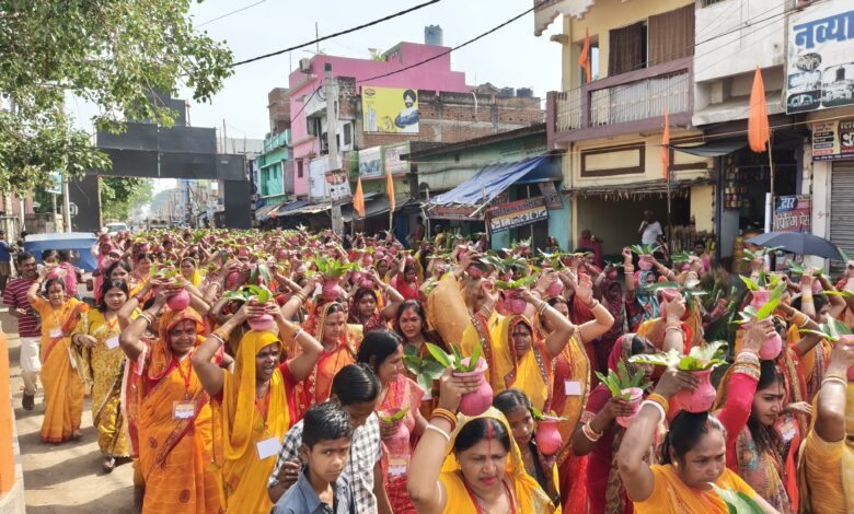 गोड्डा : आस्था, श्रद्धा और भक्ति के अनुपम संगम के बीच गोड्डा शहर के हटिया चौक स्थित माँ चैती दुर्गा मंदिर प्रांगण में ‘सहस्र चंडी महायज्ञ’ एवं ‘श्रीमद्भागवत कथा’ का भव्य शुभारंभ हुआ। पहले ही दिन आयोजन स्थल पर श्रद्धालुओं की भारी भीड़ उमड़ पड़ी, जिससे पूरा वातावरण भक्तिमय हो गया। महायज्ञ की शुरुआत से पूर्व एक भव्य कलश शोभा यात्रा निकाली गई, जिसमें 551 महिलाओं एवं युवतियों ने बढ़-चढ़कर हिस्सा लिया। पारंपरिक व केसरिया परिधानों में सजी महिलाएं सिर पर कलश लेकर जब नगर भ्रमण पर निकलीं, तो “जय माता दी” और “हर-हर महादेव” के जयकारों से पूरा शहर गूंज उठा। शोभा यात्रा मंदिर प्रांगण से प्रारंभ होकर शहर के प्रमुख मार्गों से गुजरते हुए शिवगंगा तालाब पहुंची। वहां वैदिक मंत्रोच्चार के साथ विद्वान पंडितों द्वारा विधि-विधान से पूजा-अर्चना की गई तथा कलशों में पवित्र जल भरा गया। इसके पश्चात श्रद्धालु पुनः मंदिर प्रांगण लौटे, जहां कलश स्थापना के साथ महायज्ञ का विधिवत शुभारंभ किया गया।आयोजन समिति के अनुसार, आगामी नौ दिनों तक प्रख्यात कथा वाचकों द्वारा श्रीमद्भागवत कथा का आयोजन किया जाएगा, जिसमें श्रद्धालु धर्म, ज्ञान और भक्ति का रसपान करेंगे। इस धार्मिक आयोजन को लेकर स्थानीय लोगों में खासा उत्साह देखने को मिल रहा है। मंदिर समिति एवं स्थानीय युवाओं द्वारा आयोजन को सफल बनाने हेतु व्यापक स्तर पर व्यवस्थाएं की गई हैं। श्रद्धालुओं का विश्वास है कि इस महायज्ञ से क्षेत्र में सुख-शांति, समृद्धि और सकारात्मक ऊर्जा का संचार होगा।