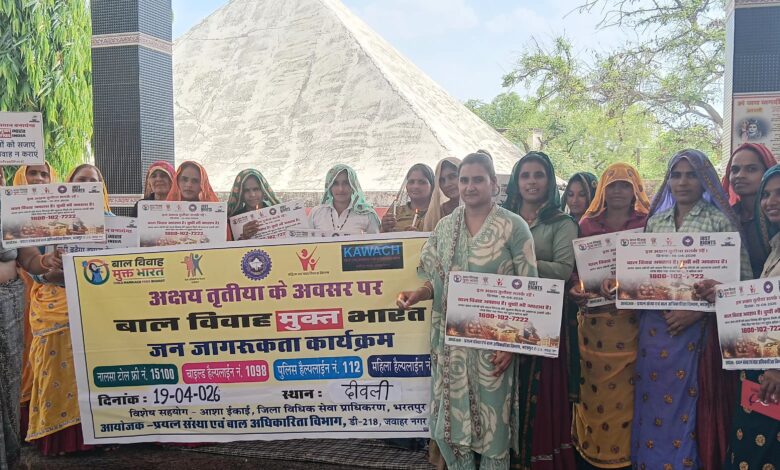 भुसावर : भरतपुर जिले के एतिहासिक शहरों में शामिल भुसावर तहसील उपखण्ड क्षेत्र की ग्राम पंचायत दीवली के बौराज में रविवार को सतर्कता दिवस के अवसर पर मॉडल एवं आदर्श बालहितेषी ग्राम पंचायत दीवली के ग्राम बौराज में एक प्रेरक कार्यक्रम आयोजित किया गया जहां कुट्टी वाले मन्दिर परिसर में ग्राम पंचायत सरपंच/प्रशासक सुश्री भाग्यश्रीजगदीश मीना के द्वारा जस्ट राइट्स फॉर चिल्ड्रन एलायन्स के सहयोग से उपस्थित ग्रामीणों ने बाल विवाह जैसी सामाजिक बुराई को जड़ से मिटाने की शपथ ली गई। अक्षय तृतीया के अबुझ सावे से पूर्व आयोजित हुए इस कार्यक्रम में सरपंच भाग्यश्री मीणा ने ग्रामीणों को संबोधित करते हुए कहा कि बालविवाह बच्चों के भविष्य से खिलवाड़ है। वहीं मन्दिर परिसर में कैण्डल जलाकर और बैनर प्रदर्शित कर ग्रामीणों ने संकल्प लिया कि वे ना तो बाल विवाह करेंगे और और ना ही अपने आस पड़ोस अथवा अपनी रिश्तेदारी में ऐसा नहीं होने देंगे। इस मौके पर पूर्व ज़िलापरिषद सदस्य श्री जगदीश मीना, प्रयत्न संस्था प्रोजेक्ट मैनेजर शालू जी पंचायत फैसिलिटेटर इन्द्रजीत, भानु कुमारी, ईश्वरसिंह, संतोष सिंह आदि सहित समस्त ग्रामवासी महिलाए पुरुष बच्चे उपस्थित रहें जिन्होंने भगवान के सामने यह शपथ ली कि हम, हमारे पड़ोसी,हमारे रिश्तेदार,18 साल से कम उम्र बेटी की शादी और 21 से कम उम्र के बेटे की शादी तो नहीं कर रहे है अगर ऐसा पाया गया तो हम उस बालविवाह को रोकने का पूरा प्रयास करेंगे और 1098 पर कॉल करके सूचना देंगे और बालविवाह नहीं होने देंगे अपनी पंचायत बालविवाह मुक्त रखेंगे तथा अपने बच्चों को सरकारी विधालयों में पढ़ने के लिए भेजेंगे हमारी ग्राम पंचायत को क्लीन एण्ड ग्रीन बनाये रखेंगे।