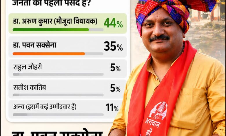 कई बड़े राजनीतिक मिशन को अंजाम दे चुके डा. पवन सक्सेना का सर्वे में लोगों की पसंद बनना चौंका रहा है। सर्वे में पहला सवाल पूछा गया है कि क्या आपके विधायक डा. अरुण कुमार को 2027 में टिकट मिलना चाहिए। केवल 23 प्रतिशत जनता ने हां कहा है और 48 परसेंट ने ना। 52 प्रतिशत ने भाजपाऔर 47 प्रतिशत ने सपा को पहली पसंद बताया है। यहां सपा का मतलब सपा कांग्रेस गठबंधन से है। केवल एक प्रतिशत शहरी जनता ही बसपा के साथ गई है। तीसरा सवाल है भाजपा से कौन सा उम्मीदवार पसंद है। ऐसे में 44 प्रतिशत लोगों ने मौजूदा विधायक डा. अरुण कुमार को ही पसंद माना है। डा. पवन सक्सेना को पसंद करने वालों की तादाद 35 प्रतिशत, सभासद सतीश कातिब को पांच प्रतिशत व राहुल जौहरी को पांच प्रतिशत लोगों ने ही पसंद किया है। यह माना जा रहा है कि जिस मीडिया हाउस की ओर से यह प्रदेश व्यापी सर्वे किया गया है, यह दिल्ली के शीर्ष नेतृत्व तक भी जायेगा। ऊपरी तौर पर तो यह माना जा रहा है कि अभी डा. अरुण कुमार के टिकट पर कोई संकट नहीं है। 79 का होने के बाद भी उनका टिकिट रिपीट होने के चांस पूरे हैं लेकिन अगर कोई बदलाव होता है तब डा. पवन कुमार सभी वर्गों में अपने बड़े संपर्क और नेटवर्क की बदौलत एक बड़े दावेदार बनकर उभर सकेंगे। स्थिति आने वाले दिनों में स्पष्ट हो सकेगी।