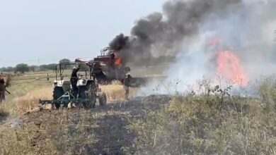 कटाई के दौरान हार्वेस्टर में लगी भीषण आग, चालक ने कूंद बचाई जान